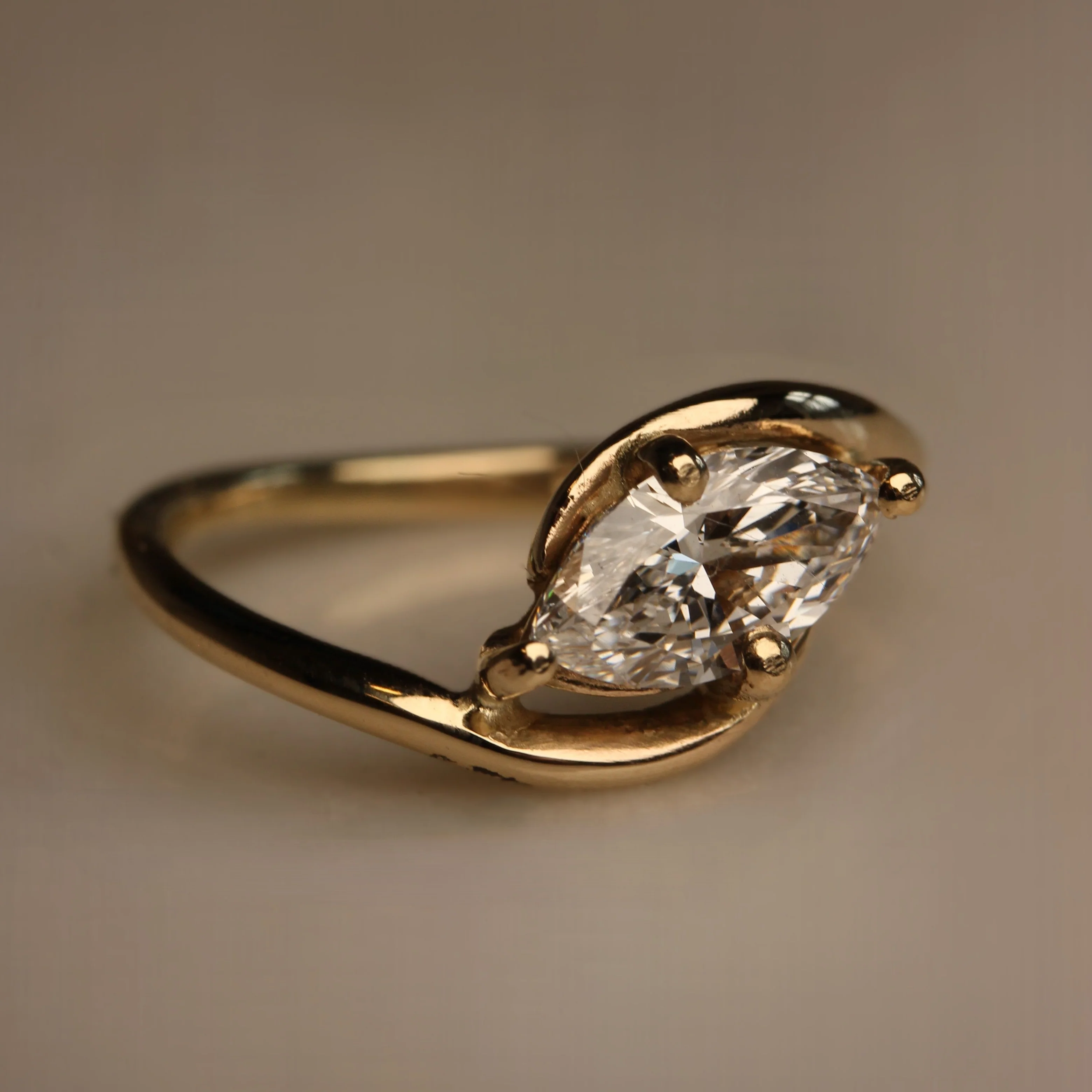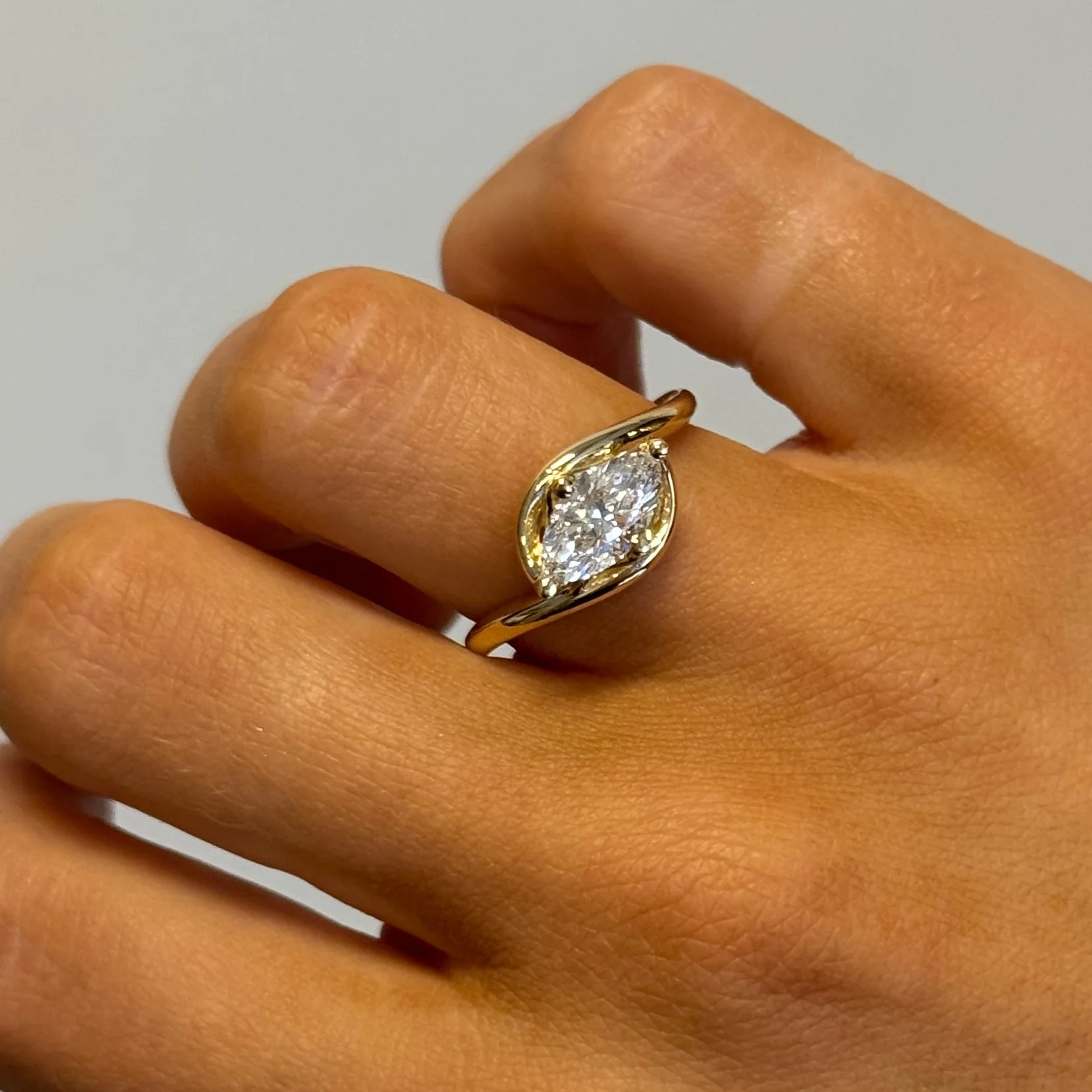 Material: 14K gold. 0.88 ct. marquise lab-grown diamond. VVS2 D.